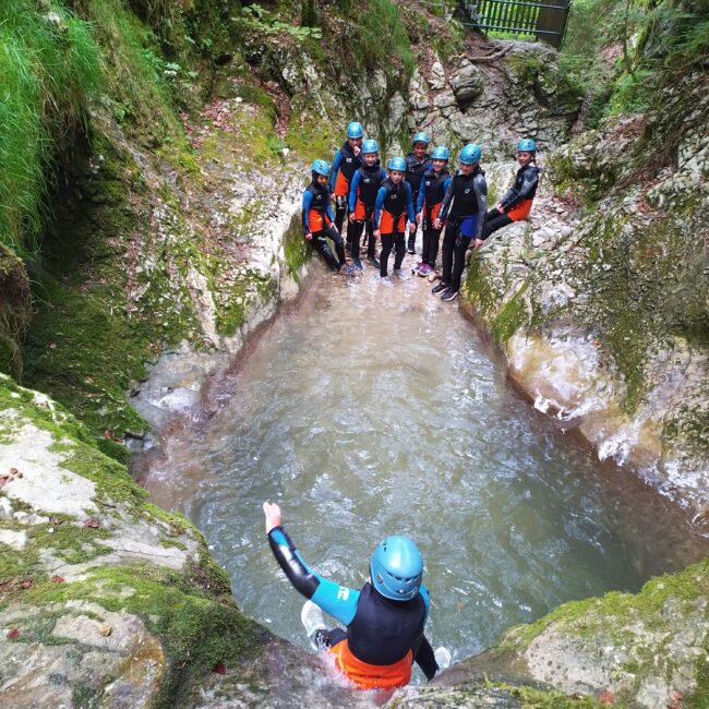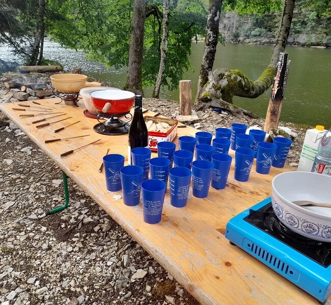 Parcours de 4 Km de canoë dans les bassins du Doubs et descente en rappel de 18 mètres avec arrivée dans l'eau.